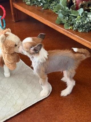 Brax is a male Chinese Crested puppy with a sweet, affectionate personality. He is playful, people-oriented, and loves cuddles. Raised in a loving environment, Besso is healthy, well-socialized, and ready to be a cherished companion. Perfect for someone looking for a loyal and loving little shadow.